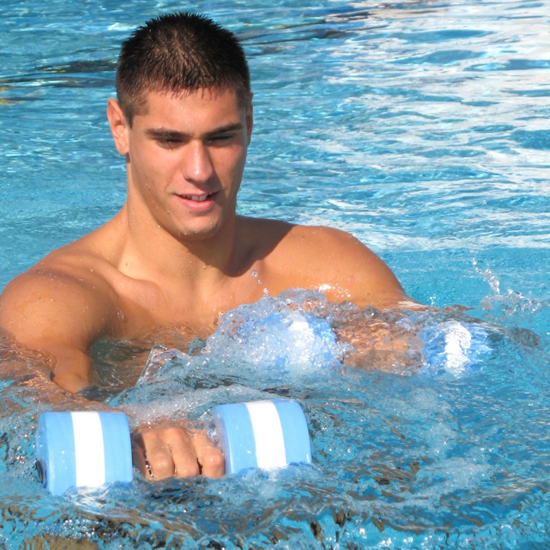 Pair of PE foam dumbells with soft hand grips, for aquafitness activities.