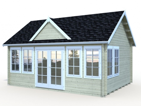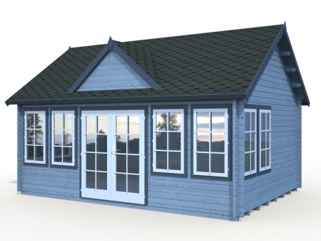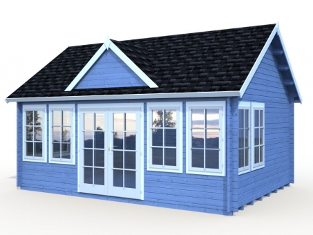 Beautifully constructed with thick 44mm Nordic spruce, this robust and stylish cabin has wind braces for rigidity, a wonderful interlocking log design and strong authentic chalet style build with straight cut log ends. The floor is 19mm tongue and groove cladding, well-known for its strength, weather resistance and durability, supported by treated foundation joists providing a long-lasting and hardwearing surface for this popular space. The stylish 19mm tongue and groove roof features a reverse apex roof and appealing dormer above the entrance doors. The double-glazed entrance doors feature full length glass, and a cylinder lock for security. For increased strength and improved resistance to adverse reactions to extreme temperatures, such as warping or cracking, the door frames are laminated in construction. To ensure good insulation the windows and doors have rubber seals and silicone. When you enter the cabin, you are greeted by a spacious interior, which is drenched in natural daylight. Eight double glazed windows provide ventilation and insulation, ensuring that this space can be used all year round. The cabin is supplied untreated with a five-year guarantee. • 5-year manufacturer's guarantee • High quality 44mm Nordic Spruce interlocking logs • 19mm tongue and groove cladding floor and roof with treated foundation joists • Double glazed entrance doors with a cylinder lock and a laminated door finish providing enhanced resistance to cracking and extreme temperatures • 8 double glazed windows providing light, ventilation and insulation • Rubber seals and silicone for good insulation • Low door sill, covered with stainless steel • *** Please note that NO ROOF COVERING is included, please select from the accessory options below ***